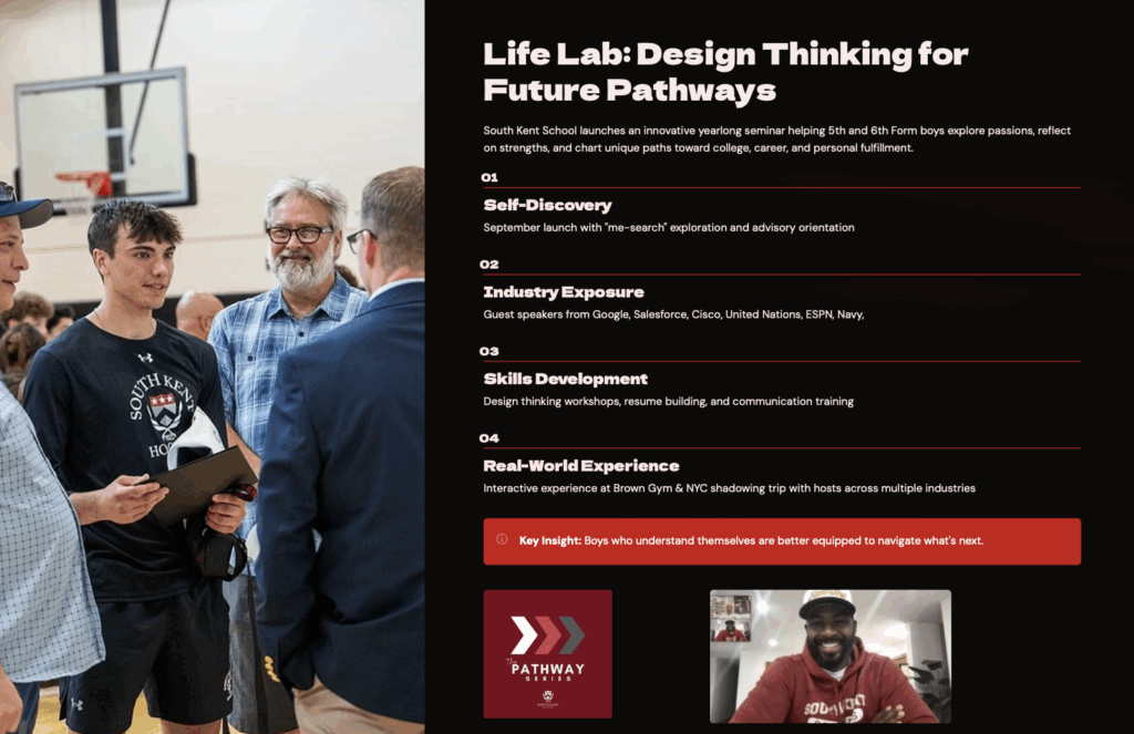 South Kent School is proud to introduce LifeLab, a groundbreaking program that helps boys build lives of purpose with confidence and clarity. Drawing from Stanford’s Life Design framework, LifeLab guides students through a year-long process of self-discovery, exploration, and career readiness.